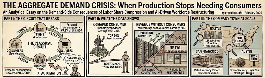 The existing tylermaddox.info framework has documented the production side of the AI transformation: who works, what gets automated, where labor share goes, what firms spend on AI capital expenditure. This piece fills the structural gap in that analysis. It asks a question that the production-side framework necessarily defers: what happens to the economic circuit when the primary source of consumer demand compresses while output capacity expands?