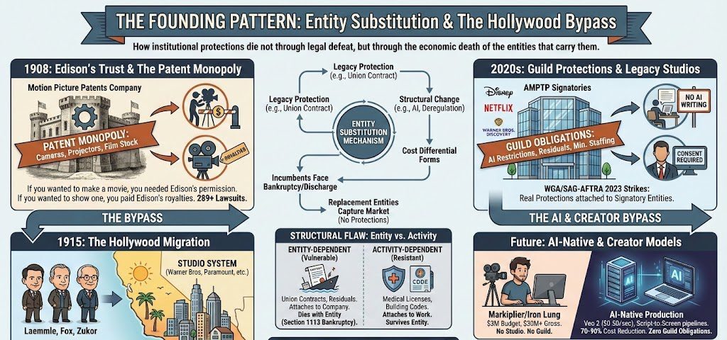 The mechanism works like this: Institutional protections are negotiated with specific entities. Those entities face cost pressure from competitors who never assumed the obligations. When the cost differential makes the protected entity uncompetitive, the entity contracts, restructures, or dissolves. The protections, being contractual obligations of the entity rather than regulations on the activity, dissolve with it. New market participants perform the same economic function — making entertainment, delivering freight, publishing news — without the legacy obligations.